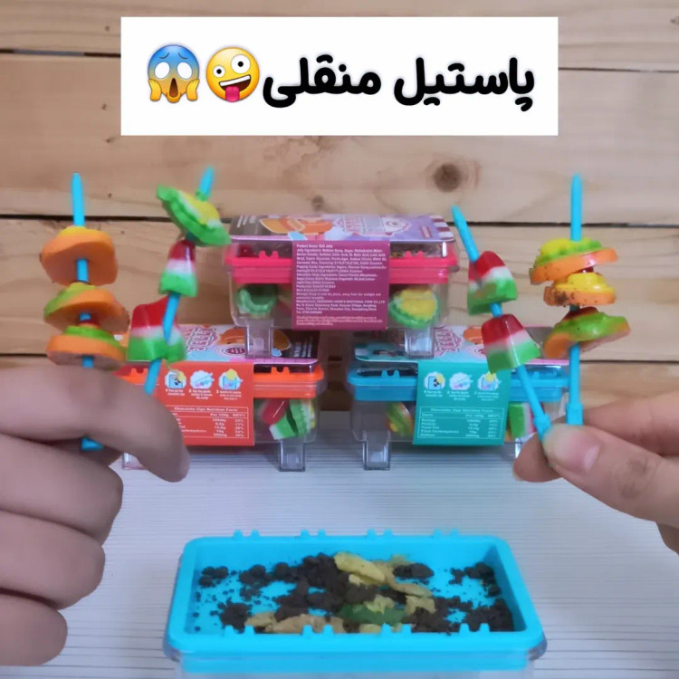 یه پاستیل خارجی با یه بسته بندی جذاب😋😇 یه منقل که شامل: یه پودر کاکائو برای ذغال منقل یه پودر جرقه ای چهارتا سیخ ویه عالمه پاستیل خوشمزه😋